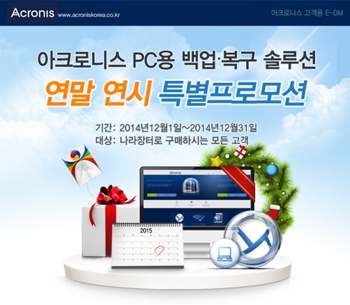 아크로니스(지사장 서호익) 는 금일(10일) 조달청 나라장터 등록 제품인 기업 및 기관용 PC 백업 솔루션 'ABR 11.5 워크스테이션(Acronis Backup & Recovery 11.5 Workstation)'을 최대 70%까지 할인된 가격에 판매하는 연말 연시 특별 프로모션을 12월 31일까지 진행한다고 밝혔다.