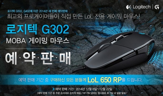 이번 프로모션은 G302의 예약판매가 진행되는 12월 8일부터 22일까지 2주간 G마켓, 옥션, 11번가에서 진행되며, 사전 구매자 전원에게 '리그 오브 레전드'에서 사이버 화폐로 전환해 사용할 수 있는 약 5천원 상당의 LoL 650 RP(Riot Points) 충전권을 증정한다.