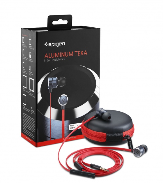 슈피겐의 '알루미늄 테카'는 MFi 인증을 받아 애플제품에 완벽히 호환되는 이어폰으로 기본적인 음악조작은 물론 전화 수신까지 가능한 iOS 특화 인라인 리모컨이 내장돼 있는 것이 특징이다. 금속 특유의 광택 및 질감을 살린 고급스런 디자인과 강렬한 레드와 블랙의 조화로 애플기기와 완벽한 매칭을 이루는 점도 돋보인다.