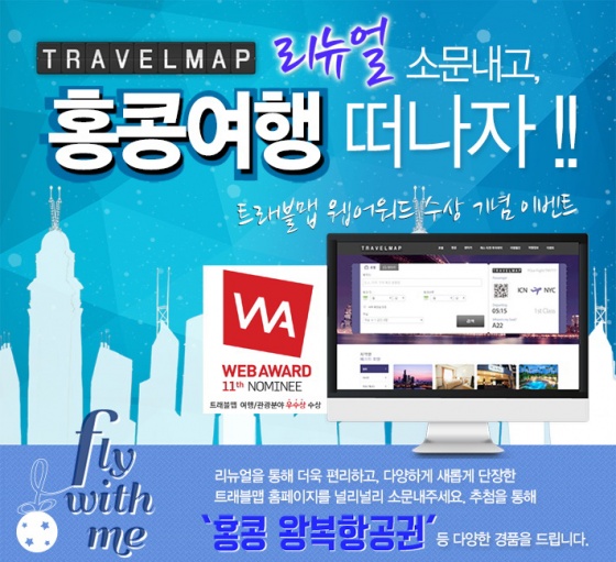 가격비교서비스를 제공하는 트래블맵(www.travelmap.co.kr)은 7일, ‘트래블맵 리뉴얼 소개하고 홍콩여행 떠나자’ 이벤트를 진행한다고 밝혔다.