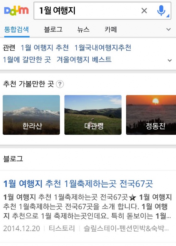 다음카카오(공동대표 최세훈, 이석우)는 8일, 다음 검색에서 이용자의 검색 의도에 적합한 국내외 여행지 정보를 자동 분석해 제공하는 '추천 가볼만한 곳' 서비스를 시작한다고 8일 밝혔다.