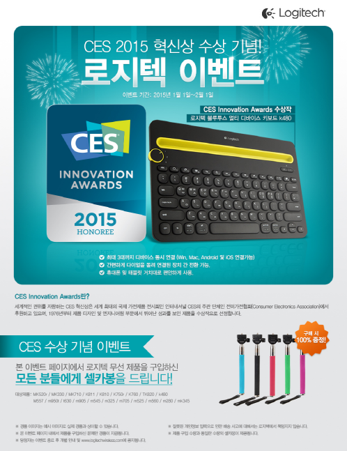 '로지텍 블루투스 멀티 디바이스 키보드 k480'의 CES 혁신상 수상을 기념해 진행되는 '무선 제품 이벤트'의 경우 이벤트 페이지에서 해당 무선 제품을 구입한 고객 전원에게 셀카봉을 제공한다. 이벤트 대상 제품은 mk520r등 무선 콤보 4종, k480등 무선 키보드 6종, m557등 무선 마우스 10종이다.