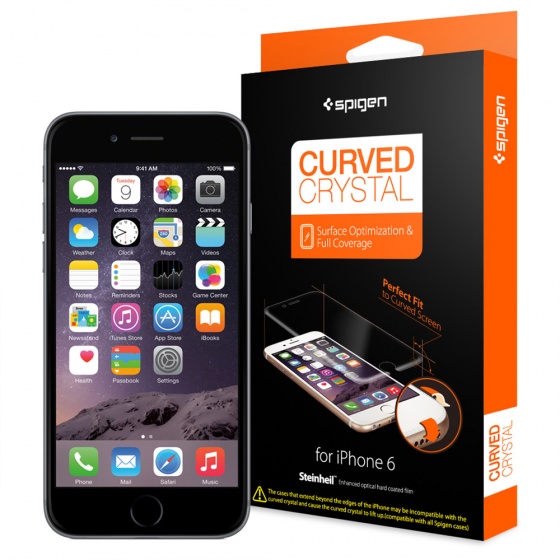 '커브드크리스탈'은 슈피겐만의 곡면성형기술을 도입해 일반 필름이 덮지 못한 아이폰6의 테두리까지 완벽하게 커버하는 액정보호필름이다. 특히 아이폰의 곡면 각도와 정확히 일치되는 디자인과 최적의 라인설계로 케이스와 함께 사용 시 필름이 밀리거나 들뜨는 현상 없이 오랜 시간 깨끗하게 액정을 보호해준다. 높은 투과율로 선명한 화면을 선사하며, 섬세하고 빠른 터치반응을 제공한다는 장점도 있다.