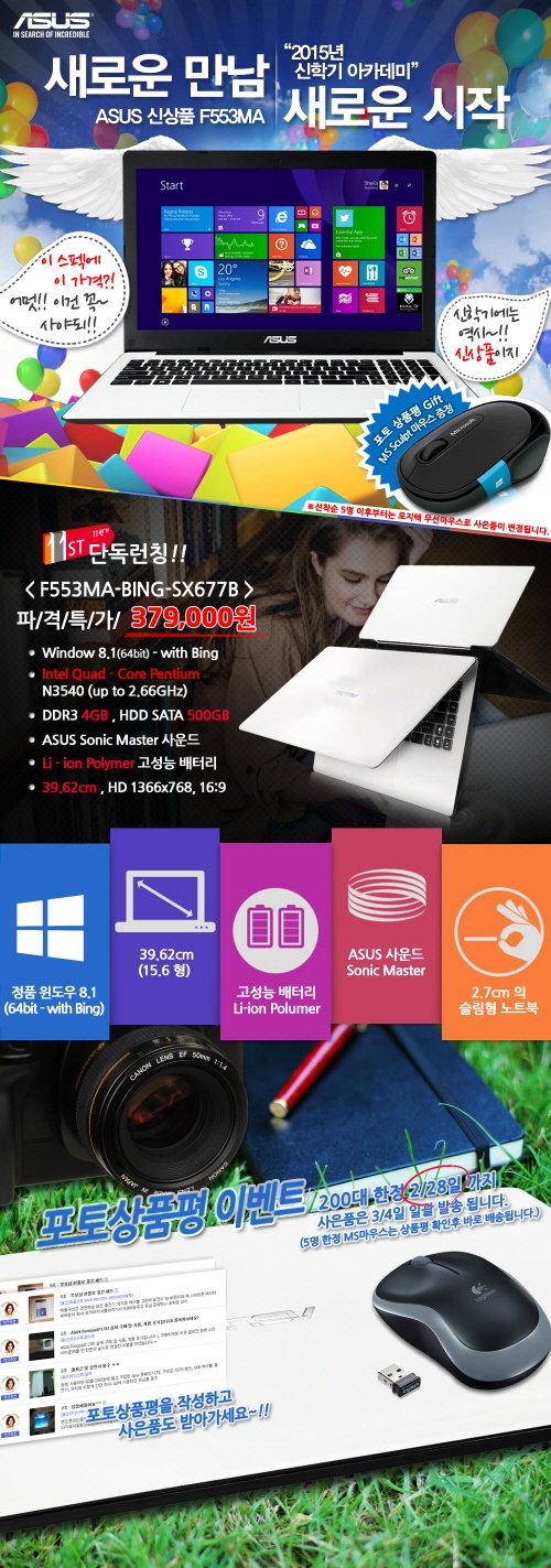 이번 행사를 통해 학생들은 화이트 색상의 에이수스 F553MA를 파격 특가 379,000원에 만나볼 수 있다. 제품 구매 후 상품평을 남긴 고객 중 200명을 추첨해 마이크로소프트 Sculpt마우스, 로지텍 무선 마우스, 마우스패드 등 푸짐한 상품을 증정하는 이벤트도 진행될 예정으로 신학기를 맞아 새 노트북을 장만하려던 고객들에게는 더할 나위 없이 좋은 기회다.