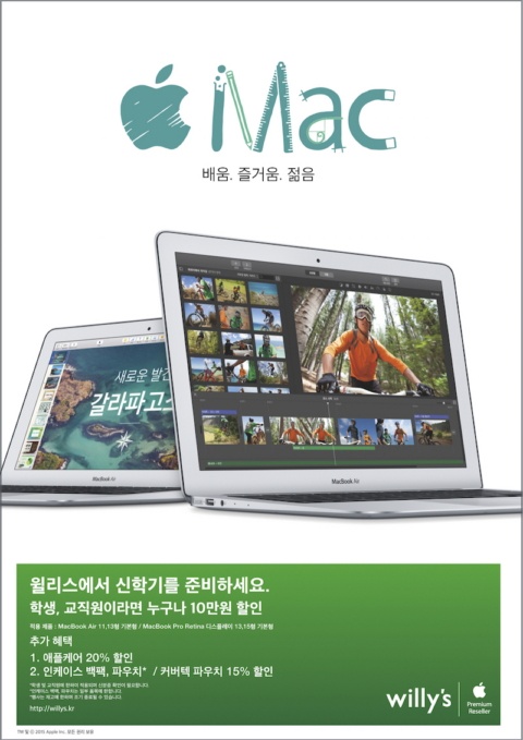 국내에서 가장 많은 애플 제품 판매 전문매장을 보유하고 있는 애플 프리미엄 리셀러 윌리스(Willys)는 신학기를 맞아 1월 18일부터 3월 28일까지 세 달 간, 전국 윌리스 매장에서 애플 맥 노트북을 구입하는 학생 및 교직원 고객들에게 10만원의 가격 할인뿐만 아니라, 품질보증 연장 서비스 할인, 백팩 및 파우치 등의 액세서리 주변기기 추가 할인 판매 등의 혜택을 제공한다.