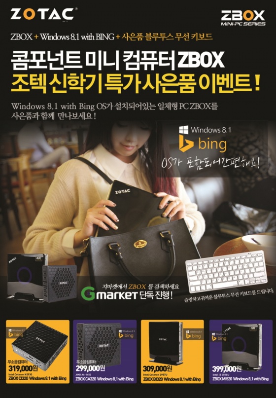 조텍코리아(ZOTAC Korea, 대표이사 김성표, www.zotackor.com)에서는 마이크로소프트사의 최신 운영체제인 Windows 8.1 with Bing을 탑재한 완제품 미니 컴퓨터 ZBOX를 구매하면 사은품을 함께 증정하는 ‘봄맞이 ZBOX 기획전’을 지마켓 단독으로 진행한다고 6일 밝혔다.