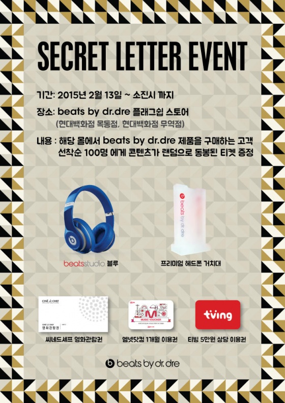 '비츠 바이 닥터드레(beats by dr. dre, 이하 비츠)'가 민족 명절인 설 연휴를 맞아 오프라인 직영샵에서 이어폰/헤드폰/스피커를 구매하는 고객을 대상으로 '시크릿 레터'를 증정한다고 13일 밝혔다.