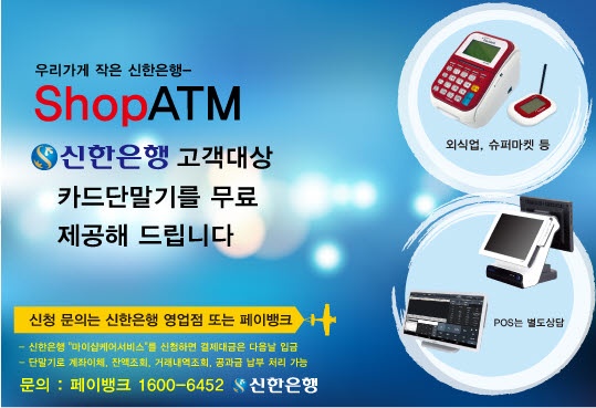 페이뱅크(대표 박상권)는 신한은행 결제계좌 유치와 마이샵(MyShop)케어 유치증대를 위해 '샵ATM(ShopATM)' 단말기 무상제공 행사를 실시한다고 밝혔다.