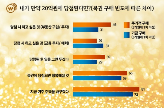 20억 원에 당첨되었을 때 복권을 주기적으로 구매하는 사람들은 그렇지 않은 사람들과 어떤 차이를 보일까? 복권을 3개월에 1회 이상 구입하는 사람들과 그렇지 않은 사람들로 나누어 '20억 원에 당첨된 후 계획'에 대해 비교 분석한 결과 다음과 같은 특성이 나타났다.
