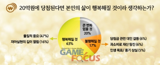20억 당첨이 본인을 행복으로 이끌 것이라는 응답률은 3개월에 1회 이상 복권 구매자 집단이 더 높게 나타났다. 이들의 66%가 복권 당첨으로 행복한 삶을 예상, 그렇지 않은 이들보다 7% 높게 나타났다.