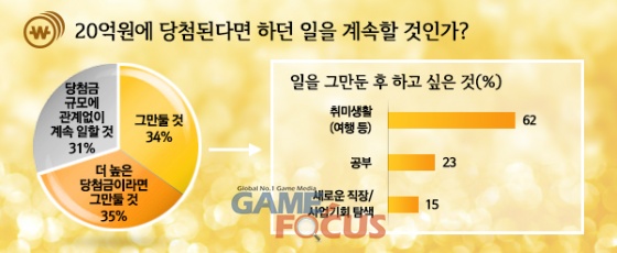 '20억에 당첨되면 하던 일을 계속할 의향이 있는가?'는 질문에 대해서는 34%가 '그만두게 될 것'이라고 응답하였으며, '당첨금 규모에 관계 없이 하던 일을 계속할 것'이라는 응답은 31%로 나타났다. '복권 당첨 후 일을 그만두고 나면 무엇을 하겠는가?'는 질문에 '취미생활(여행 등)'을 즐기겠다는 응답이 62%, 뭔가 다른 일을 하겠다는 응답이 38%로 나타났다.