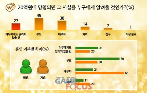 '20억에 당첨되면 그 사실을 누구에게 알리겠는가(복수응답)?'라는 질문에 응답자의 49%가 '부모'를, 38%가 '배우자'를 지목하였으며, '아무에게도 알리지 않겠다'는 응답은 27%로 나타났다. 가족 외의 인물에게 알리겠다는 응답은 10% 미만이었다. 이는 응답자의 혼인 여부에 따라 큰 차이를 보였는데, 미혼 응답자는 부모를, 기혼 응답자는 배우자를 지목한 비율이 뚜렷하게 높았다.