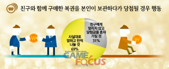 또한 '만약 친구와 같이 구매한 복권을 본인이 가지고 있다가 당첨될 경우 어떻게 하겠는가?'는 질문에 대해 '사실대로 말하고 반씩 나눌 것'이라는 응답은 69%, '친구에게 알리지 않고 당첨금을 혼자 가질 것'이라는 응답은 31%로 나타났다.