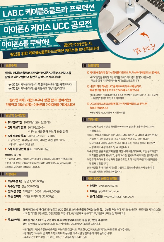 모바일 액세서리 브랜드 LAB.C(랩씨)가 아이폰6/6 플러스용 케이블 & 울트라 프로텍션 케이스 홍보를 위한 UCC 공모전을 진행한다고 밝혔다.