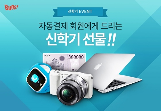 먼저 신학기 선물로 인기가 높은 맥북에어, 소니 미러리스 카메라, 백화점 상품권, 웨어러블 키즈폰 등 4가지 경품을 제공한다. 벅스 웹(http://ppl.cm/Bugs_SpringEvent)과 모바일 애플리케이션에서 참여할 수 있다. 이벤트 대상 회원이 원하는 상품 한 가지를 선택해 응모하면, 추첨을 통해 총 4명에게 해당 제품을 선물하는 방식이다.