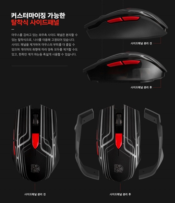 또한, 사용자의 취향에 맞게 마우스의 사이드패널을 분리 및 장착 가능한 탈 착식으로 제작하여 손의 크기 및 그립감에 따라 변경할 수 있는 것도 큰 특징이다.