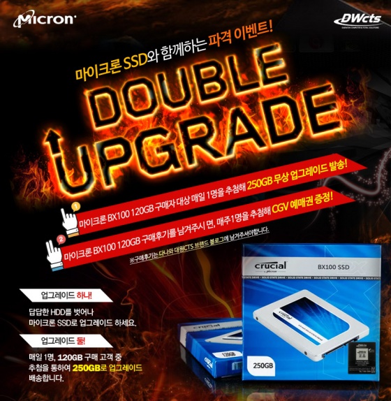 대원CTS(http://www.dwcts.co.kr/ 대표이사 정명천)는 마이크론 SSD의 명성을 이어갈 차기 라인업의 출시를 기념하고, 전작의 커다란 성공에 원천이 된 소비자에게 혜택을 되돌리기 위해 대대적인 이벤트를 개최한다고 1일 밝혔다.