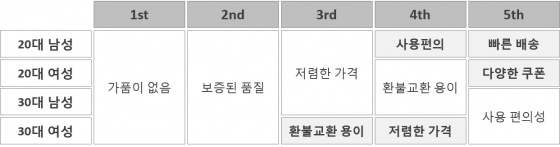 이에 반해 ‘빠른 배송’은 20대 남성만 중요하게 생각하고 있었으며 ‘친절한 배송’은 전 연령과 성별의 응답결과 순위권에 들지 못했다. 이는 소셜커머스에서는 “양질의 상품과 서비스를 저렴하고 편리하게 구매한다”는 본원적인 측면이 배송 보다 중요하기 때문으로 해석된다.