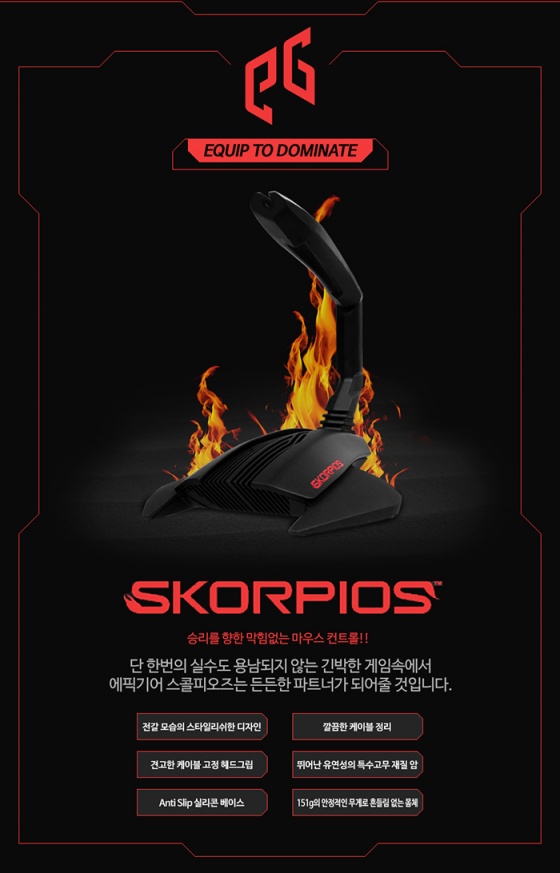 스콜피오스(SKORPIOS)마우스 번지는 에픽기어(EPIC GEAR)만의 스타일리쉬한 전갈 디자인으로 제작 되었으며, 거친 움직임과 빠른 마우스 이동에서 흔들림 없는 151g의 안정적인 무게로 사용자의 편리성을 중심으로 설계되었다.