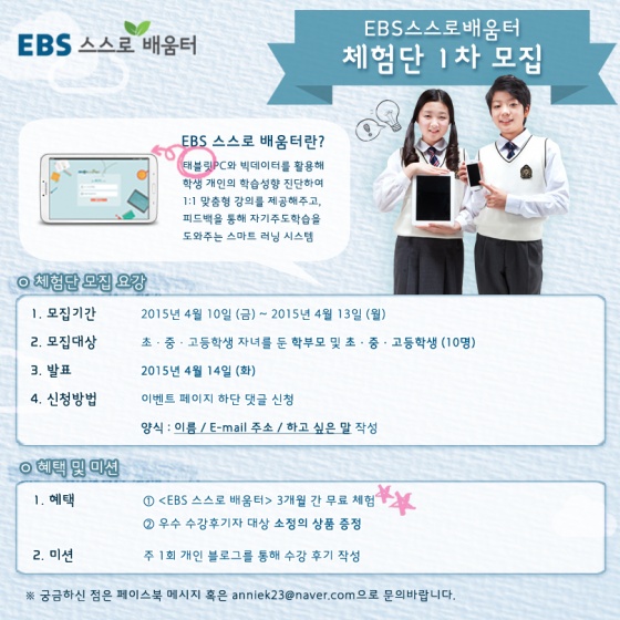 EBS 스스로배움터가 초, 중, 고등학생 자녀를 둔 학부모 및 학생 가운데 온라인 카페 활동과 블로그를 운영하고 있는 열혈 학부모 및 학생들을 대상으로 'EBS 스스로배움터 체험단'을 모집한다.
