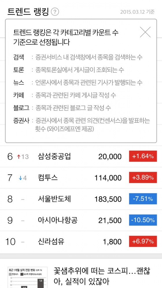 증권 트렌드 서비스에서는 일 별로 ▲네이버 증권 내 검색 빈도 ▲토론실 게시글 조회 수 ▲카페, 블로그의 관련 글 생성 수 ▲언론사 종목 관련 뉴스 발행 수 ▲증권사 종목 관련 의견 발표 수를 각각 카운트해 카테고리 별 '트렌드 랭킹' 및 '트렌드 차트'를 제공한다.