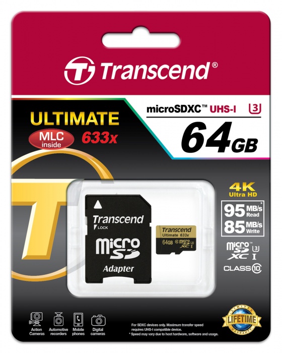 트랜센드의 microSDHC/SDXC UHS-I U3 633배속 Ultimate PRO는 최고 사양의 MLC 낸드 플래시를 채용하여 오랜 기간 사용에도 변함없는 성능을 보장한다. 읽기 95MB/s, 쓰기 85MB/s의 빠른 전송속도로 고화질 3D, 4K Ultra HD, Full HD 급 영상 촬영에 최적의 환경을 제공한다. 또한 빠르게 움직이는 피사체를 담아내는 연사 촬영에도 완벽하게 대응한다. 최신 액션캠, 고사양 캠코더, 스마트폰, 태블릿, 차량용 블랙박스 등 다양한 멀티미디어 기기와 호환되며 UHS-I 사양을 지원하지 않는 기기에서는 최소 10MB/s의 연속 쓰기 속도를 지원한다.
