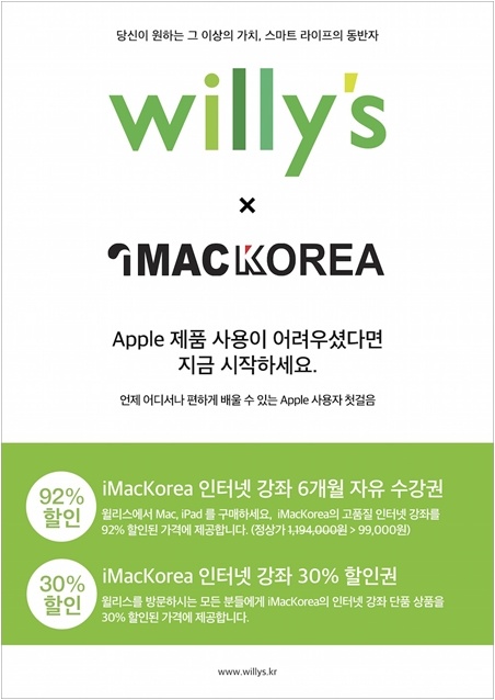 iMacKorea (http://imackorea.com/) 는 윌리스의 고객 지원 온라인 강좌 서비스로, Apple 입문 고객을 대상으로 사용법, 애플리케이션 및 다양한 Apple 솔루션 교육을 지원하며, 사내강좌 및 현장강좌 서비스도 제공하고 있다.