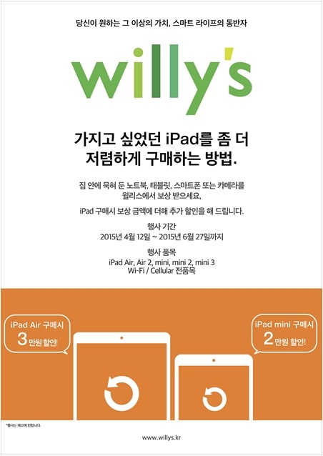 윌리스(willy's, 대표 공선욱, http://www.willys.kr) 는 구형 노트북, 태블릿, 스마트폰, 카메라를 보유하고 있는 고객들을 위해 최신 iPad Air와 iPad mini를 저렴하게 구입할 수 있는 'iPad 보상 판매 프로모션'을 6월 27일까지 진행한다고 밝혔다.