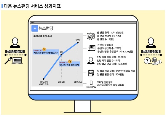 다음카카오(공동대표 최세훈, 이석우)가 운영하는 신개념 크라우드 펀딩 서비스 뉴스펀딩이 출시 반년 만인 4월 21일 후원금 10억원이라는 놀라운 성과를 달성했다고 30일 밝혔다. 일 최다 후원금액 3,970만원, 일 평균 후원금액 500만원으로 30일 현재 후원금10억 5천만원을 모으며 가파른 성장 곡선을 그려가고 있다. 최근에는 간편 결제 서비스 카카오페이까지 더해져 쉽고 편리한 후원 시스템으로 펀딩이 더욱 활성화될 전망이다.