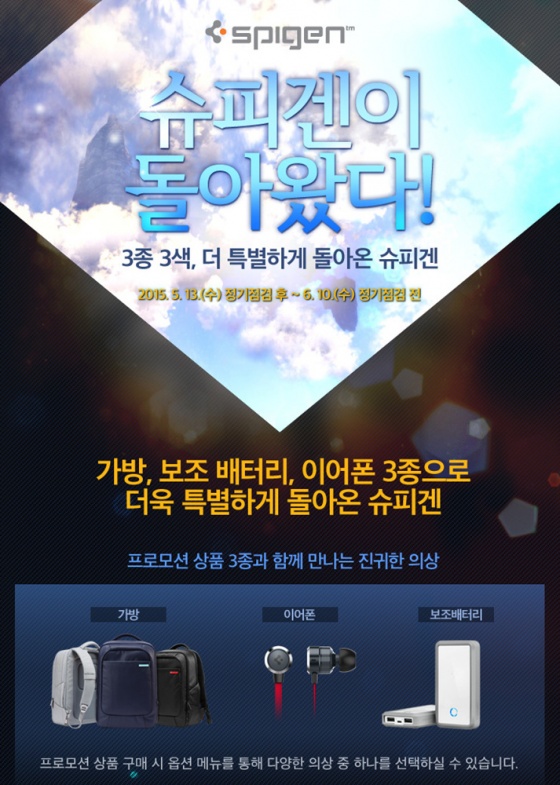 '슈피겐이 돌아왔다!'는 그 동안 슈피겐 및 블레이드 & 소울에 많은 관심과 성원을 보내준 유저들을 위해 특별히 기획한 이벤트로 슈피겐의 프리미엄 모바일 액세서리 구매 시 선착순으로 소장가치가 높은 다양한 의상 아이템을 제공한다.