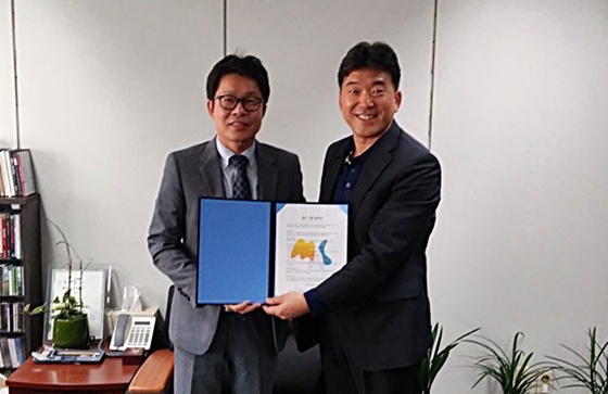 이창기 마포문화재단 대표(왼쪽)와 씨스퀘어소프트 박현진 대표이사가 문화예술 분야에 대한 업무협약을 체결한 뒤 기념촬영을 하고 있다.