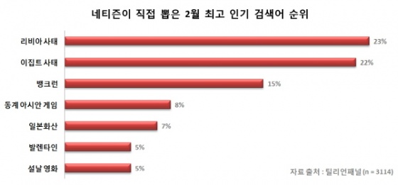 분석 결과에 따르면 2월의 최고 화제 검색어는 ‘리비아사태’로 나타났으며, 그 뒤를 이어 ‘이집트사태’, ‘뱅크런’ 등이 차례로 2, 3위에 랭크됐다. 그 외에도 ‘동계아시안게임’(4위), ‘일본화산’(5위), ‘발렌타인’과 ‘설날 영화’가 공동 6위로 그 뒤를 이었다.