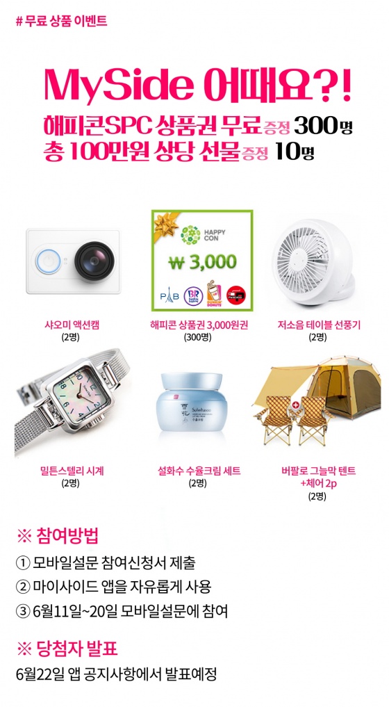 또한 310명의 참가자를 대상으로 샤오미 액션캠, 밀튼 스텔리시계, 설화수 수율크림세트, 버팔로 그늘막 세트와 의자, SPC 상품권 등 약 200만원 상당의 상품을 증정한다. 당첨자는 6월 22일 마이사이드를 통해 공지된다.