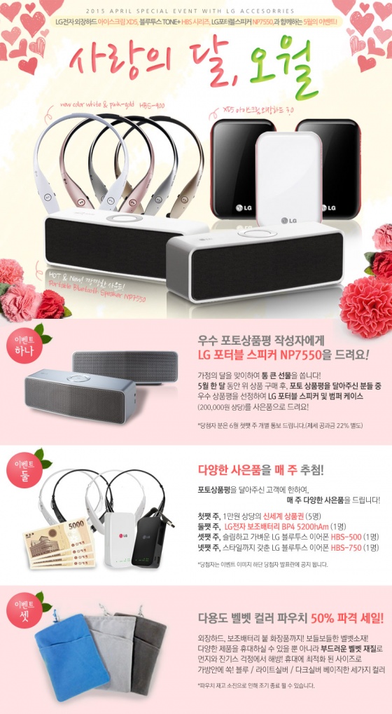 5월 한달 간 G마켓, 옥션, 11번가, 롯데닷컴, 현대몰, AK쇼핑몰, CJMALL O쇼핑 등에서 진행되는 이번 이벤트는 제품 구매 후 우수 포토상품평 작성자에게 포터블 스피커를 증정하는 한편, 백화점 상품권과 LG전자 보조배터리 BP4 5200mAh, 블루투스 이어폰 등의 사은품을 매주 추첨을 통해 포토상품평 작성자에게 증정을 한다. 또한 외장하드 보관용 벨벳 컬러 파우치를 기간 내에 50% 할인하여 판매한다.