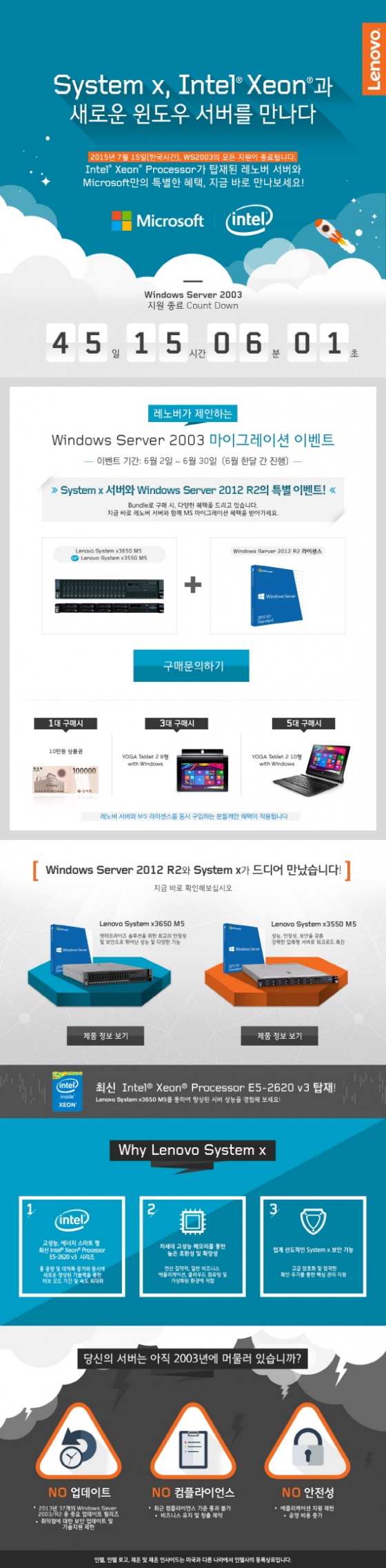 한국레노버(대표이사: 강용남, www.lenovo.co.kr)가 7월 15일 윈도 서버 2003 지원 종료에 대비해 서버를 교체하는 고객들을 대상으로 6월 2일부터 6월 30일까지 한달 간 System x 서버 프로모션을 진행한다고 2일 밝혔다. 대상 제품은 레노버 System x M5 서버군에서 가장 인기있는 서버 제품인 System x3650 M5와 System x3550 M5이다.