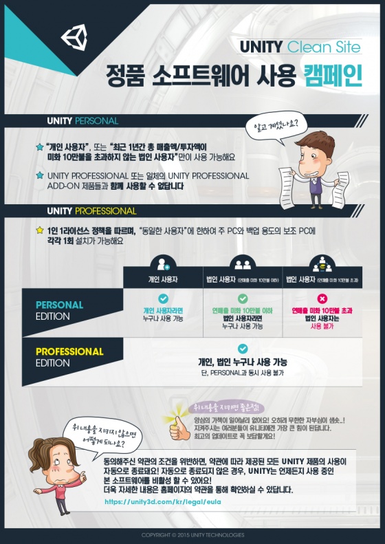 이번 'UNITY Clean Site' 캠페인은 유니티 사용에 대한 안내사항과 주의사항을 알기 쉽게 정리해 유니티 개발자 커뮤니티 및 개발사에 배포, 국내 유니티 유저들이 정품 소프트웨어에 보다 쉽게 접근할 수 있도록 한다는 계획이다.