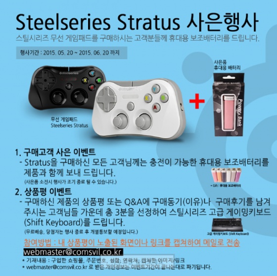 www.steelseries.com)는 온라인종합몰과 애플 프리미엄 리셀러샵 에이샵(a#shop)에서 '스트라투스' 제품을 구매한 고객 모두에게 스마트폰, 카메라 충전 시 유용한 휴대용 보조배터리를 제공하는 '스트라투스 사은행사'를 오는 20일까지 실시한다고 3일 밝혔다.