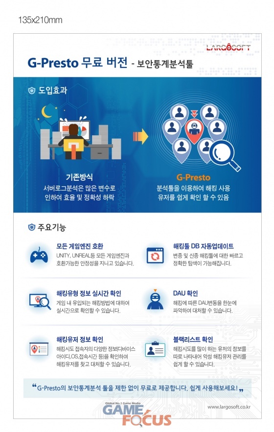 'G-Presto'는 대부분의 모바일 게임개발 엔진에 적용되는 높은 호환성과 안정으로 바탕으로 상용화 서비스 이후부터 지금까지 주목받고있는 보안 솔루션으로 WEB(www.largosoft.co.kr)에서 이루어지는 적용작업이 매우 간편하여 추가적인 개발자 인력 없이 2~3분만에 쉽게 적용되는 강점을 지니고 있다.