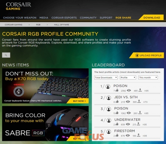 http://gaming.corsair.com/en/rgbshare/hall-of-fame) 다운로드뿐만 아니라 사용자가 직접 만든 RGB 프로필을 업로드하고, 다른 이용자들과 공유할 수 있다.