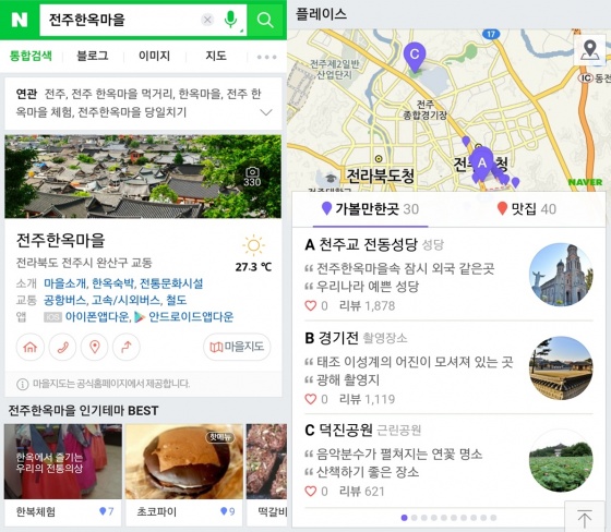 또 이용자 검색이 빈번한 맛집 리뷰의 경우에는 모바일 환경에 최적화시켜 '수제 만두로 유명한 전주한옥마을 맛집', '한옥마을 유명한 바게트 햄버거' 등과 같이 직관적으로 손쉽게 리뷰를 확인할 수 있도록 '마이크로 리뷰' 형태로 제공된다.