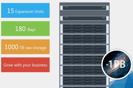 또한 듀얼 RC18015xs+ 컴퓨팅 노드에 최대 15대의 RXD1215sas를 연결하여, 180 드라이브와 1PB가 넘는 새로운 저장공간으로 대규모 확장이 가능하다.