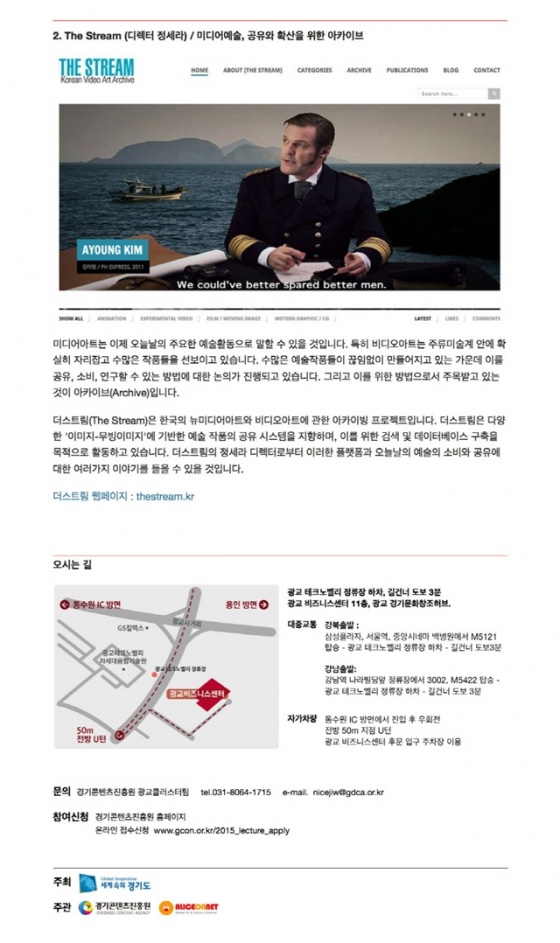 경기콘텐츠진흥원(원장 곽봉군)은 오는 18일부터 '광교 경기문화창조허브'에서 '마이크로소프트', 'ILM' 등 글로벌 기업과 '코이안', '더스트림' 등 미디어아트 전문 기업이 참여하는 주제 특강을 두 달간 펼친다고 17일 밝혔다.