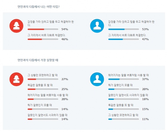 먼저 '연인과의 다툼에서 나는 어떤 타입?'이란 설문에 여성의 53%, 남성의 53%가 '감정을 가라 앉히고 텀을 두고 해결해야 한다'고 응답했다. '그 자리에서 바로 대화로 해결한다'고 응답한 비율은 여성의 47% 였고, 남성의 47%가 응답했다.