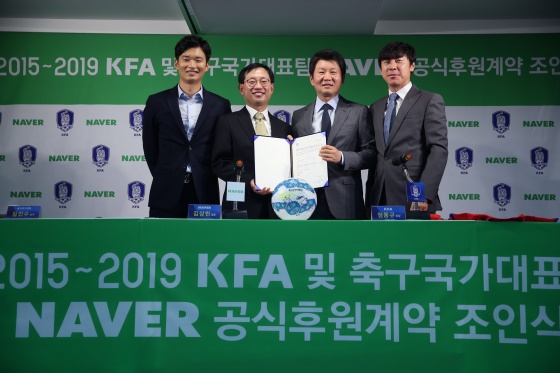 네이버(주)(대표이사 김상헌)가 대한축구협회(회장 정몽규)와 한국 축구 발전을 위한 협약식을 맺고, 2019년까지 4년간 다방면에서 공식 후원하기로 결정했다고 23일 밝혔다.