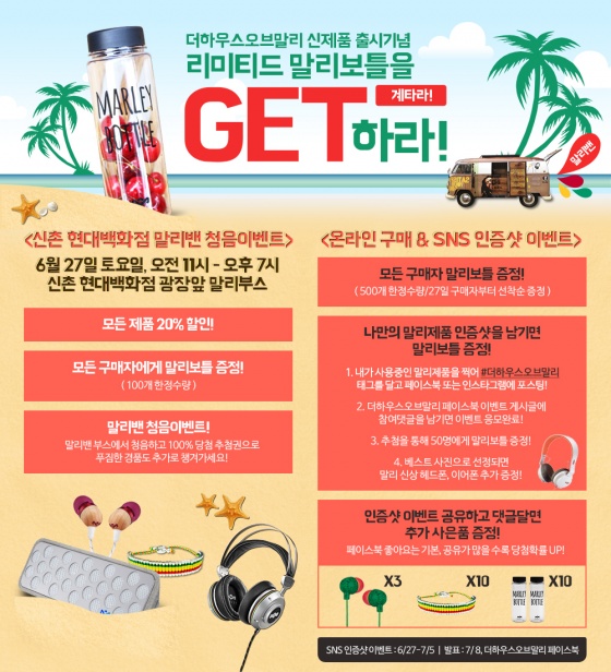 6월 27일부터 온라인 구매 시에도 모든 구매자에게 말리보틀을 500개 한정수량으로 선착순 증정하며, 말리 제품 인증샷을 페이스북이나 인스타그램 등 개인 SNS에 포스팅하면 추첨을 통해 50명에게 말리보틀을 증정한다. 인증샷을 찍어 #더하우스오브말리 태그를 달고 포스팅 후, 더하우스오브말리 페이스북 이벤트 게시글에 참여 댓글을 남기면 된다. 베스트 사진으로 뽑히면 헤드폰과 이어폰을, 이벤트 내용을 공유하고 댓글 달면 이어폰과 팔찌, 보틀을 추가로 증정한다.