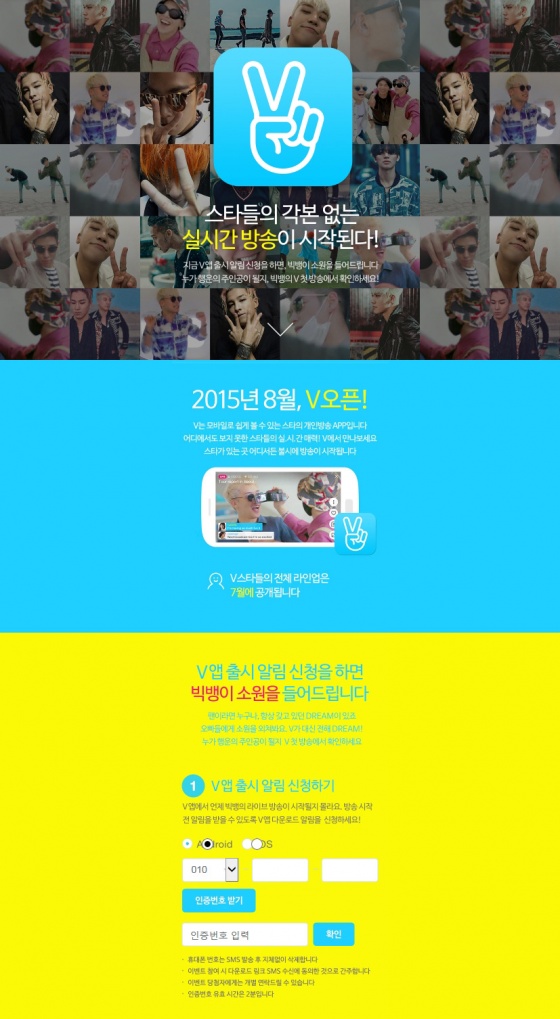 'V(브이)'는 기존 서비스와는 차별화되는 '셀러브리티의 개인 방송 생중계'를 콘셉트로 하는 별도의 모바일 애플리케이션 서비스다. 글로벌 이용자를 주 타깃으로 하는 만큼 한글이 아닌 영어 버전으로 출시될 예정이다. 해당 서비스를 통해, 이용자는 평소에는 쉽게 접하기 어려운 스타들의 일상 및 다양한 모습을 생생한 영상으로 확인할 수 있다.