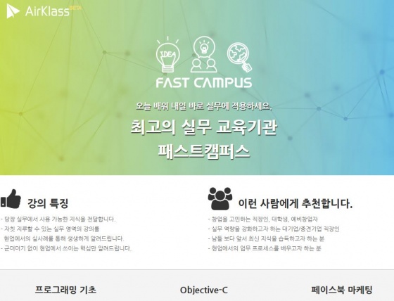 www.airklass.com)와 업무 제휴를 맺고, 패스트캠퍼스 온라인 강좌를 오픈 한다고 2일 밝혔다.