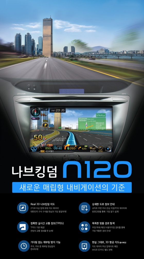 '나브킹덤 N120'은 나브킹덤 리얼 3D지도를 기반으로 실측 고도값이 반영된 도로는 물론 주변 시설물, 자연환경까지 실제와 동일하게 대한민국 전역을 가장 생생하게 구현한다. 나브킹덤 지도는 27GB 이상 업계 최대 지도 데이터를 기반으로 현실 그대로의 지도를 표현하고, Dual Core CPU/1GB RAM을 적용하여 대용량의 3D지도를 안정적으로 표현한다.