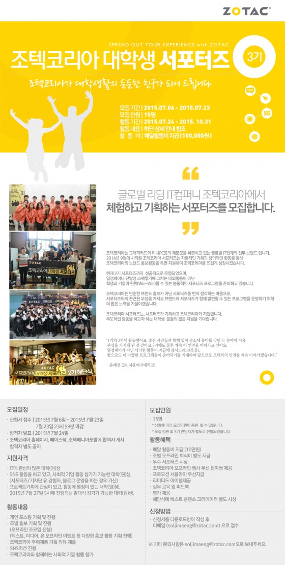 조텍코리아(ZOTAC Korea, 대표이사 김성표, www.zotackor.com)에서는 조텍코리아의 다양한 IT 기기 체험 및 오프라인 이벤트, 사회적 기업 활동 등을 직접 체험 할 수 있는 '조텍코리아 대학생 서포터즈 3기’를 7월 7일부터 모집한다고 밝혔다.