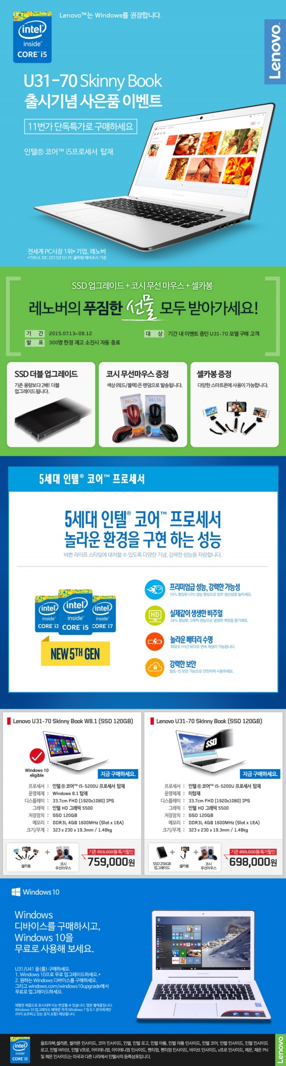 U31은 11번가에서 단독 판매 되며, 한국레노버는 선착순 300명의 구매고객을 대상으로 SSD 더블 업그레이드 (운영체제 미탑재 모델 한정)를 비롯해 무선 마우스, 셀카봉을 제공한다.